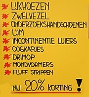 Als leek kun je er vreemd tegenaan kijken, de termen en handelingen die voor mensen in de uitvaartwereld heel normaal zijn. Zie dit bordje waarmee een bedrijf in uitvaartproducten tijdens een regionale uitvaartbeurs sommige producten in de aanbieding doet.