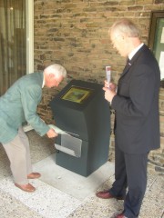 Tijdens de presentatie in Zeist. Een trouwe bezoeker aan de begraafplaats print de eerste route. Daarnaast de verantwoordelijk wethouder van Zeist, Frits Huijgen.